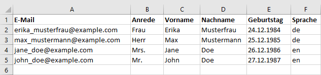 Abonnenten: ImportWahrscheinlich haben Sie bereits eine Liste von Adressen zusammengestellt, die Sie per Newsletter anschreiben möchten. Über das universelle CSV-Dateiformat lassen sich Ihre Adressen aus nahezu jeder Datenbank oder Tabellenkalkulation (z. B. Microsoft Office oder Open Office) exportieren und anschließend in crosseye Marketing importieren. Um die Zuordnung der Spalten (z. B. Vorname, Nachname, E-Mail) beim Import zu erleichtern, sollte die erste Zeile Ihrer CSV-Datei aussagekräftige Spaltenüberschriftten enthalten. Ein Beispiel: