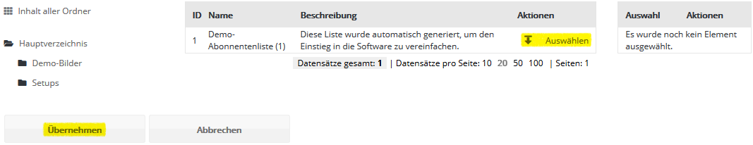 Schritt 3 - AbonnentenlistenWählen Sie nun aus, in welche crosseye Marketing Abonnentenliste ihre CSV-Datei importiert werden soll. Falls Sie zuvor keine eigene Abonnentenliste in crosseye Marketing angelegt haben (siehe Menü Abonnentenlisten), steht zum schnellen Einstieg die leere Abonnentenliste 'Demo-Liste' bereit. Diese Liste wird in der Regel bei der Einrichtung Ihres crosseye Marketing Kontos angelegt und zur Demonstration mit einem Beispiel-Abonnenten befüllt.