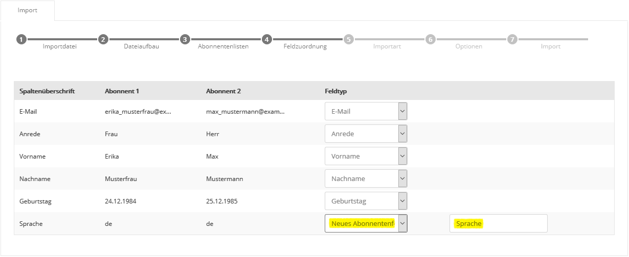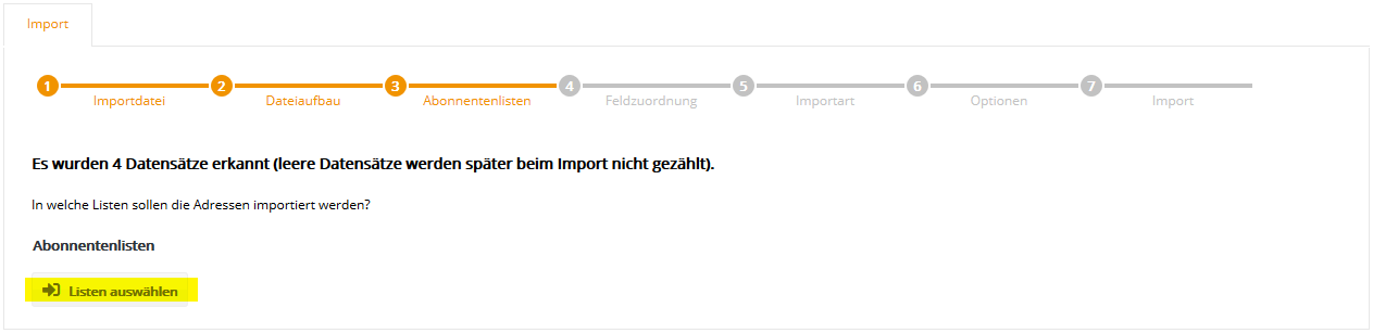 Auch die Auswahl mehrerer Abonnentenlisten ist möglich, falls Sie parallel in mehrere Listen importieren möchten. Klicken Sie nach Auswahl der gewünschten Liste(n) auf 'Übernehmen' und anschließend auf 'Weiter'. Der Name einer Abonnentenliste lässt sich im Menü Abonnentenlisten auch nachträglich jederzeit ändern. Schritt 4 - FeldzuordnungIn Schritt 4 teilen Sie crosseye Marketing mit, welche Spalte (z.B. Vorname, Nachname) Ihrer CSV-Datei in welches crosseye Marketing Abonnentenfeld importiert werden soll. Zum schnellen Einstieg sind typische Abonnentenfelder wie 'E-Mail', 'Anrede', 'Vorname' und 'Nachname' in crosseye Marketing bereits vorhanden.
