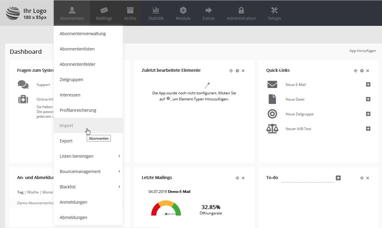 Zum Abspeichern Ihrer Daten wählen Sie bitte je nach Version Ihres Office-Paketes das Exportformat CSV UTF8 (Trennzeichen-getrennt) oder CSV (Trennzeichen-getrennt). Import Schritt für Schritt erklärtUm Ihre CSV-Datei in crosseye Marketing zu importieren, wählen Sie im Menü 'Abonnenten' den Punkt 'Import':