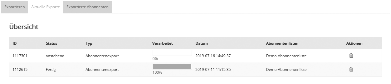 Durch Klick auf die Schaltfläche 'Exportieren' startet crosseye Marketing den Export und wechselt zu 'Aktuelle Exporte'. Hier sehen Sie den Fortschritt des aktuellen Exports. Dem Verlaufsbalken sowie dem jeweils angezeigten Status entnehmen Sie, wann der Export erfolgreich abgeschlossen ist. Im Reiter 'Exportierte Abonnenten' finden sie die Export-Datei, die Sie nach einem Klick auf 'Download' auf Ihrem Computer speichern können.