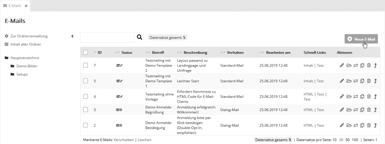 Unter 'Mailings' --> 'E-Mail' finden Sie die Übersicht aller E-Mails, die noch nicht beendet sind. Hier entwerfen, verwalten und versenden Sie Ihre Mailings.