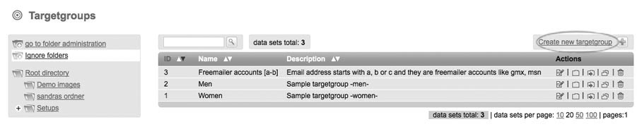 In crosseye Marketing, you are offered the option to sort the subscribers in target groups. There are many possibilities for organization – such as sex, age or interests. In order to simplify the beginning, 3 target groups are already defined in crosseye Marketing.