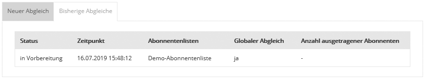 Daraufhin startet crosseye Marketing den Abgleich. Im Reiter 'bisherige Abgleiche' können Sie den Status des Fortschrittes einsehen. Nach Fertigstellung wird Ihnen die Anzahl der ausgetragenen Abonnenten angezeigt. |