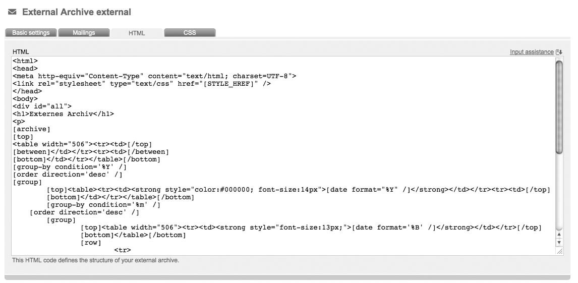 While creating your external archive, crosseye Marketing generates an html source code in the background, which defines the structure of your external archive. If you want to edit the look of your shown archive, you have to edit the source code, which requires appropiate HTML knowledge.