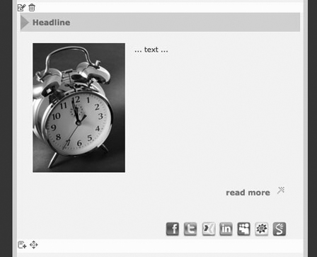 The container encloses the dynamic article-sector and must to be created necessarily at the beginning. The end-tag of a container means the end of the dynamic sector. In space of this container you can create and sort your elements. An element means for example an article with an image on the rightend side, or an article without an image or just an image. Open and close elements with the element-tags. To realize the input of content, every element needs as many as one block. Contents of an article can be sorted and edited seperately with the help of blocks. Depending on the desired content, input fields can exist of different types: