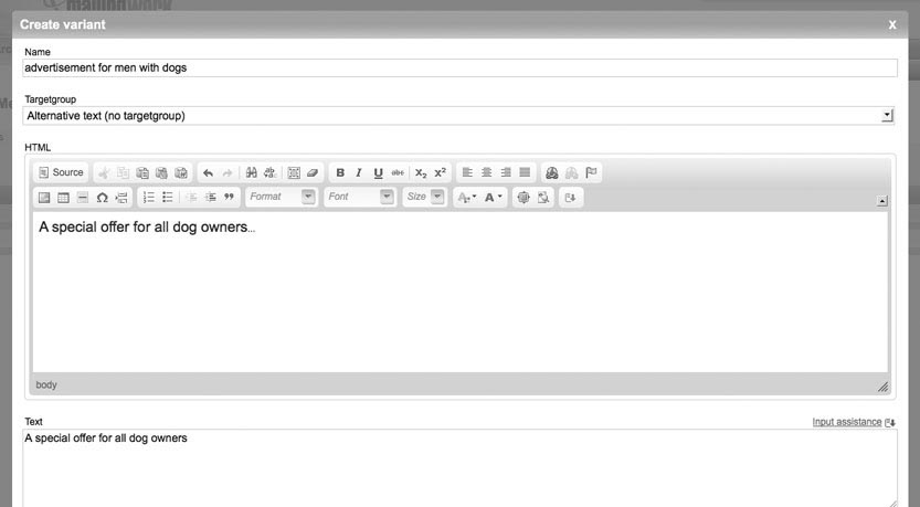 What is a dynamic content?With the help of dynamic contents, you can specialize a landingpage to a specific targetgroup or a single subscriber. Those contents, which you've still defined for a specific targetgroup or a single subscriber, are visible just for relevant subscribers. Let's take a look at an example: Through a survey you got specific information about your subscribers. You can divide your subscribers in female or male. Also you've got a link in your database, whose subscribers are animal owners or not.In a new mailing to all animal owners, only men with an animal should see a specific dynamic content. Create a dynamic contentClick 'create new dynamic content' and a new tab will open. Set your wanted settings. |