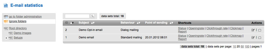 Here you find the statistics of all sent mails. For easier access crosseye Marketing already includes a demo-mail you can view. |