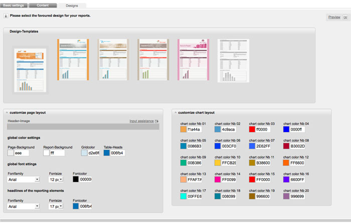 Now you also can adjust the design of your report. Choose the tab 'designs'. By default crosseye Marketing suggests you six different layouts. HTML experts can also open the 'advanced settings' below the layouts to edit the html-code. For example you can insert your logo in th header.