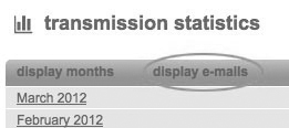 In the transmission- statistic you see the data collected from crosseye Marketing (Traffic, Total). Also you see, if exist, the numbers of test-sendings, clicks on the subsriber-link and the number of subscribers who have completed the optin-confirmation. Next to the view 'display months' you also can select 'display e-mails'. So crosseye Marketing outputs the above mentioned figures for each mailing.