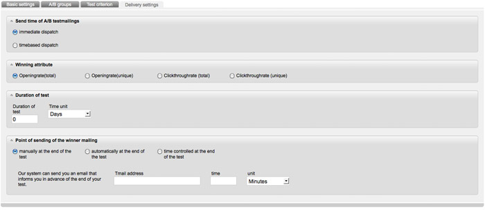 In the last tab you define the settings for the dispatch. Determine by which criterion (opening-rate or click-through-rate) crosseye Marketing should identify the winner. Equally important is to determine the duration of the test.