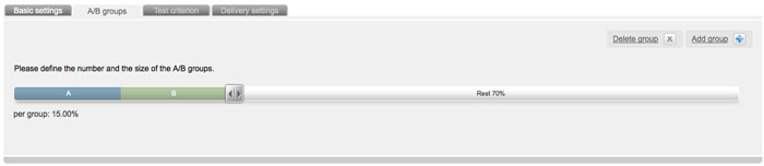 After you did these basic settings you can adjust the number and the size of your A/B groups by clicking the button 'next'. For that you can use the convenient slider. You can add more groups with the button 'Add group' or delete them by clicking 'Delete group'. You can create up to seven different A/B groups.