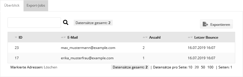 Reiter 'Überblick'Hier werden alle E-Mail-Adressen aufgelistet, deren Versendungen aufgrund von drei aufeinanderfolgenden Hardbounces zurückgehalten werden. Diese Adressen werden auf der crosseye Marketing-internen 'Retained List' gesammelt. Verwaltet werden hier ausschließlich die reinen E-Mail-Adressen, unabhängig von den dazugehörenden (eventuell ehemaligen) Abonnenten. Oben rechts können Sie mit Klick auf den 'Exportieren'-Button die zurückgehaltenen E-Mail-Adressen als CSV-Datei exportieren. Die erzeugte CSV-Datei lässt sich anschließend auf dem Reiter 'Export-Jobs' herunterladen.