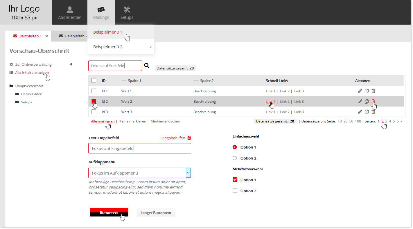Die Bedienelemente der Vorschau dienen als optisches Beispiel, ohne dass sie eine Funktion ausführen. Sie können gefahrlos die optische Wirkung verschiedener Einstellungen testen. Erst mit Klick auf Speichern werden die Einstellungen in Ihren Account übernommen.