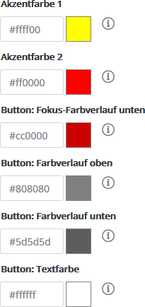 Für die Buttons lassen sich 3 Standardfarben und 3 Fokus-Farben wählen. Sie bestehen jeweils aus einem zweifarbigen Hintergrund und der Textfarbe.