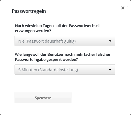 Button 'Passwortregeln'Hier wählen Sie für alle Benutzer eine globale Vorgabe der Passwortregeln. Möchten Sie für bestimmte Nutzer eine kürzere oder längere Passwortwechsel-Zeitdauer festlegen, ist das an deren Benutzerrolle einstellbar. Vorrang hat immer die Einstellung der Benutzerrolle.